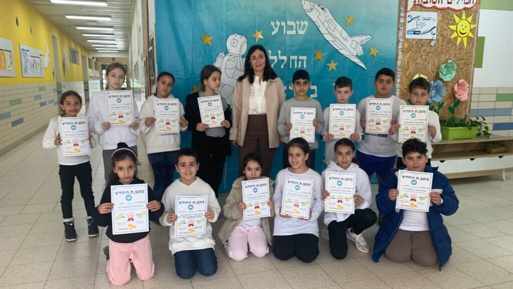 תלמידי בית הספר בשכבות הצעירות והגבוהות במפגש קבלת תעודות הצטיינות, בדגש על ערך האחריות. ישר כוח!